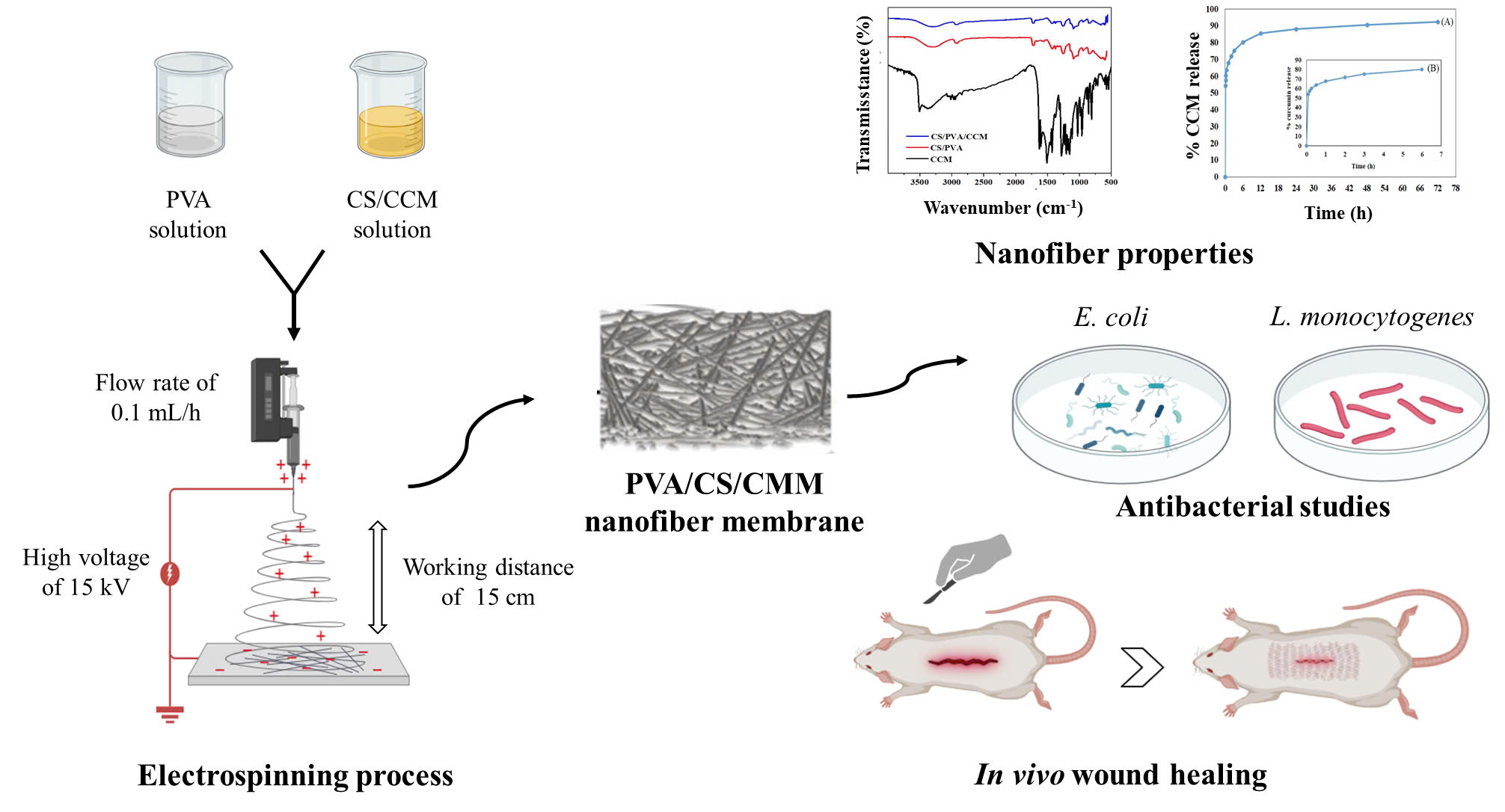 Wound healing nanofiber membranes were successfully fabricated by electrospinning of chitosan (CS) and polyvinyl alcohol (PVA) solution in the presence of curcumin (CCM). As a results, the optimal material parameters included 2% (w/v) for the CS concentration, 8% (w/v) for the PVA concentration, 3% for the CCM concentration (by mass of CS), 3/7 for the CS/PVA volume ratio; the process parameters of 15 cm for the needle tip-to-collector distance, 15 kV for the applied voltage, and 0.1 mL/h for the solution flow rate. The obtained membranes exhibited the relatively uniform diameter fibers distributed from 200 to 450 nm, average diameter at 348.55 ± 51.48 nm, smooth fiber surface, and uniform fiber texture. The fourier transform infrared spectroscopy (FTIR) results demonstrated the presence of CCM in the CS/PVA/CCM membrane, thereby showing that the structure of CCM is not changed during the fabrication. In-vitro test showed that the amount of CCM released significantly from CS/PVA/CCM membrane during the first 6 hours (up to 80.28%), it was followed by maintain at a rather slow rate, and the maximum CCM released was 92.26% after 72 h. The prepared CCM membrane exhibits high antibacterial activity against Gram-negative (Escherichia coli) and Gram-positive (Listeria monocytogenes) bacteria strain, which is an important property of wound healing membrane. Remarkably, CS/PVA/CCM nanofiber membrane accelabrates healing process in rats with incised wounds and demonstrates superior healing ability comparing to CS/PVA membrane and commercial bandages. In brief, CS/PVA/CCM nanofiber membrane is a potential wound dressing with good healing and high antibacterial properties.