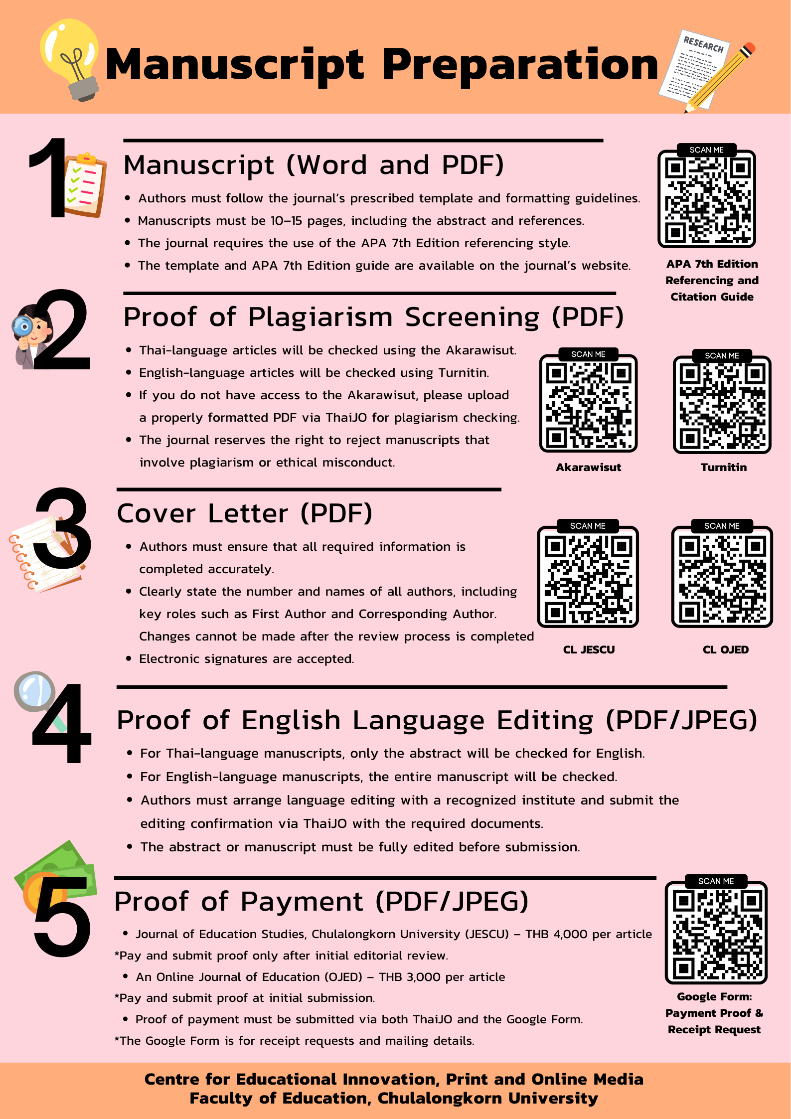 ***Authors can view and download sample supporting documents, including the ThaiJO system user guide, article template, cover letter form, APA 7th edition referencing guide, and payment form, in the following section, “Download”