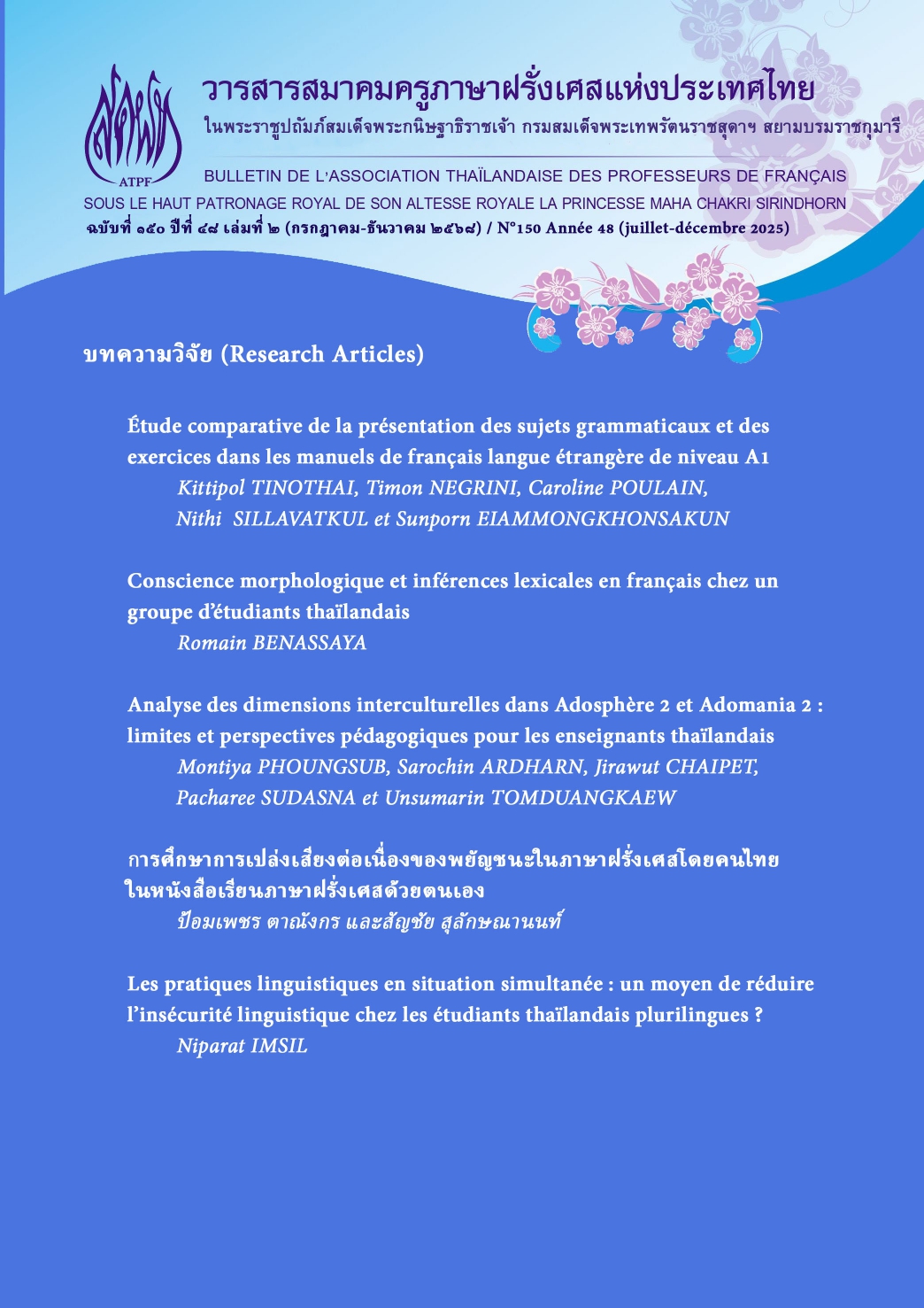 Cet article s’inscrit dans ma recherche intitulée « Insécurité linguistique et apprentissage des langues étrangères chez les étudiants de la faculté des sciences humaines de l'université Naresuan ». Il a pour objectifs 1) d’identifier les moyens utilisés par les étudiants pour réduire ou faire disparaître le sentiment d’insécurité linguistique à l’égard de leurs pratiques langagières en classe, 2) d’observer leurs pratiques linguistiques en contexte professionnel, et 3) d’explorer les sentiments liés à l’utilisation des langues étrangères pendant le stage. Pour ce faire, des méthodes mixtes ont été privilégiées, combinant des questionnaires et des entretiens destinés à recueillir les perceptions et les expériences des étudiants de la faculté des sciences humaines de mon université. L'analyse des données révèle que de nombreux étudiants éprouvent de l'angoisse, du stress, voire de la peur au début de leurs études d’une langue étrangère. Elle met également en évidence leur souhait de bénéficier de pratiques linguistiques en situation — que ce soit en classe, à la maison ou en milieu professionnel — afin de s’habituer aux langues et de renforcer leurs compétences linguistiques. La pratique régulière des langues en situation simulée les aide à renforcer leur confiance en eux et à se sentir plus à l’aise lorsqu’ils doivent s’exprimer, car ils se sont familiarisés avec le vocabulaire, la syntaxe et la grammaire. De plus, chaque situation simulée leur apprend à connaître des mœurs, des éléments culturels, et des façons d’agir dans la société ou dans le monde de travail. Ces pratiques contribuent ainsi à atténuer le sentiment d’insécurité linguistique chez les étudiants thaïlandais.