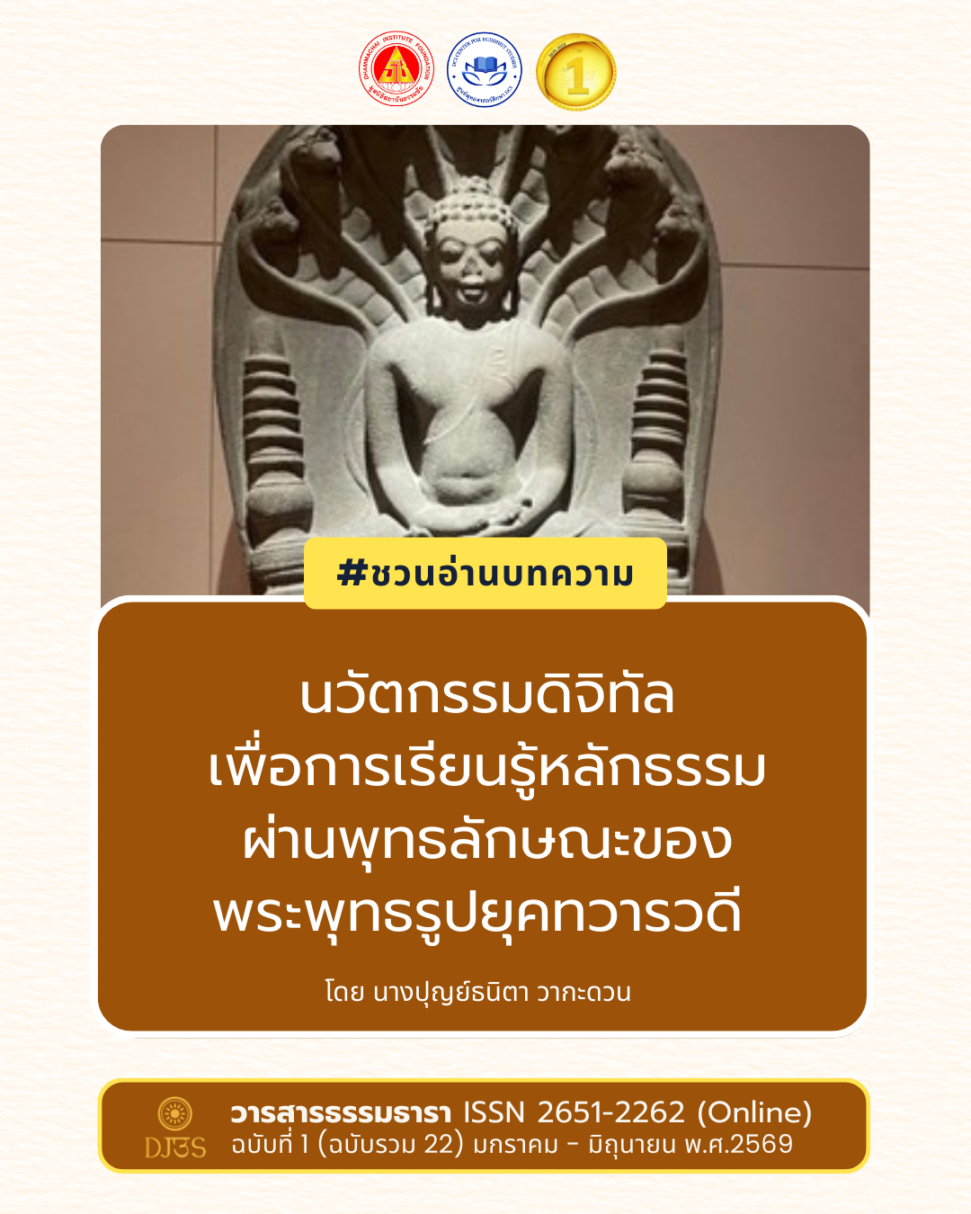 5. บทความวิจัยเรื่อง “นวัตกรรมดิจิทัลเพื่อการเรียนรู้หลักธรรมผ่านพุทธลักษณะของพระพุทธรูปยุคทวารวดี” โดย นางปุญย์ธนิตา วากะดวน ได้ศึกษาคุณค่าของหลักธรรมที่ซ่อนอยู่ในพุทธลักษณะของพระพุทธรูปปางต่างๆในยุคทวารวดี และได้สร้างนวัตกรรมดิจิทัลในรูปแบบสารคดี ชื่อ “ประตูเมืองท่า ทวารวดี” เพื่อถ่ายทอดหลักธรรมและคุณค่า (คติธรรม จิตใจ ศิลปวัฒนธรรม สังคม) ที่ซ่อนอยู่ในพระพุทธรูปยุคทวารวดีปางต่าง ๆ และได้รับความพึงพอใจสูงจากผู้ชม
