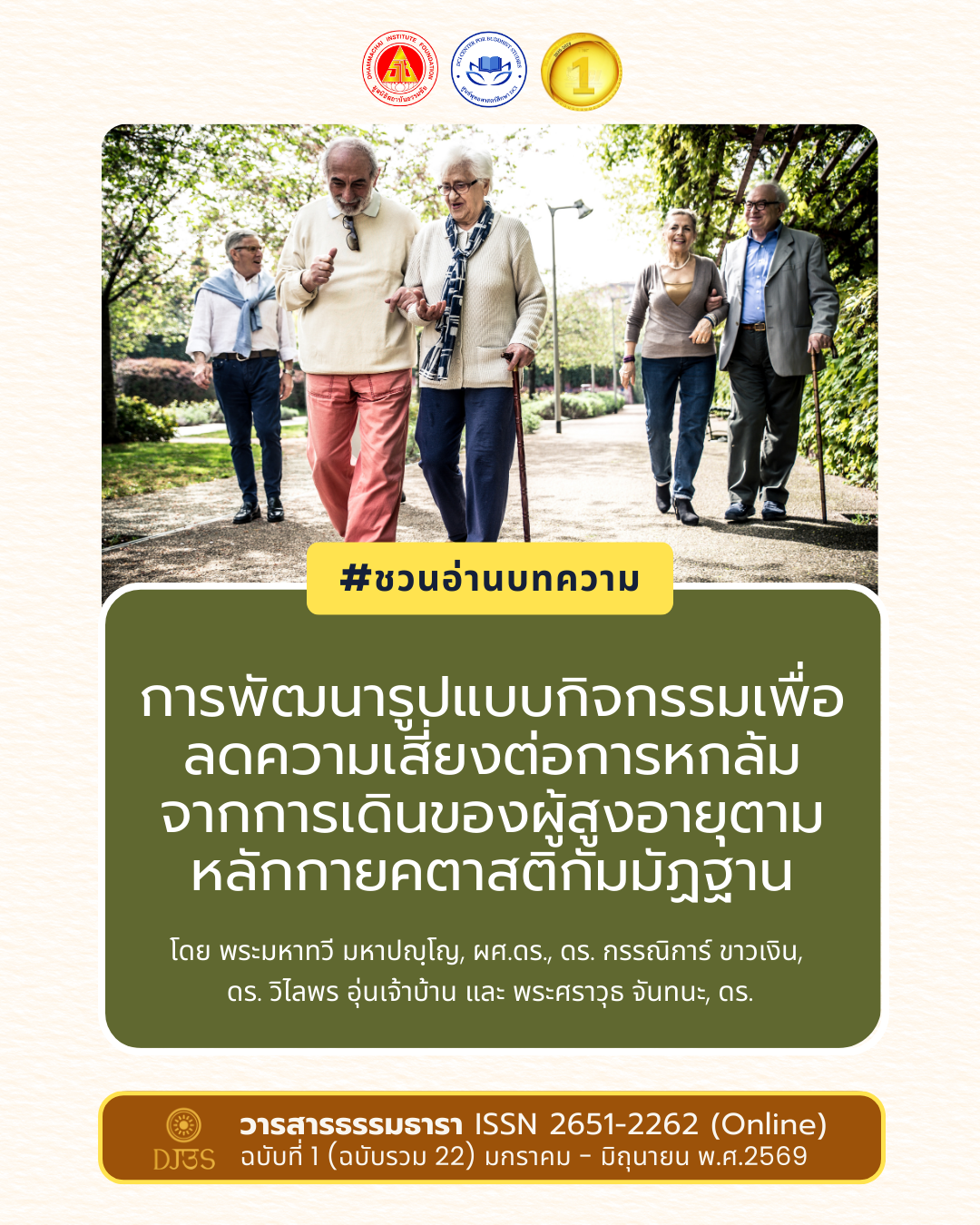 2. บทความวิจัยเรื่อง “การพัฒนารูปแบบกิจกรรมเพื่อลดความเสี่ยงต่อการหกล้มจากการเดินของผู้สูงอายุตามหลักกายคตาสติกัมมัฏฐาน” โดย พระมหาทวี มหาปญฺโญ, ผศ. ดร. และคณะ ได้นำเสนอการพัฒนารูปแบบกิจกรรมตามหลักกายคตาสติกัมมัฏฐาน เพื่อลดความเสี่ยงต่อการหกล้มในผู้สูงอายุ ผลการทดสอบยืนยันว่ากิจกรรมช่วยเพิ่มความสามารถในการทรงตัวได้อย่างมีนัยสำคัญทางสถิติ และได้องค์ความรู้ใหม่คือ “6 รู้ ปรับความเสี่ยง...เลี่ยงการล้ม” ซึ่งเน้นการฝึกสติอยู่กับลมหายใจ อิริยาบถย่อย การพิจารณากาย และความรู้ด้านอาหารที่เหมาะกับวัย