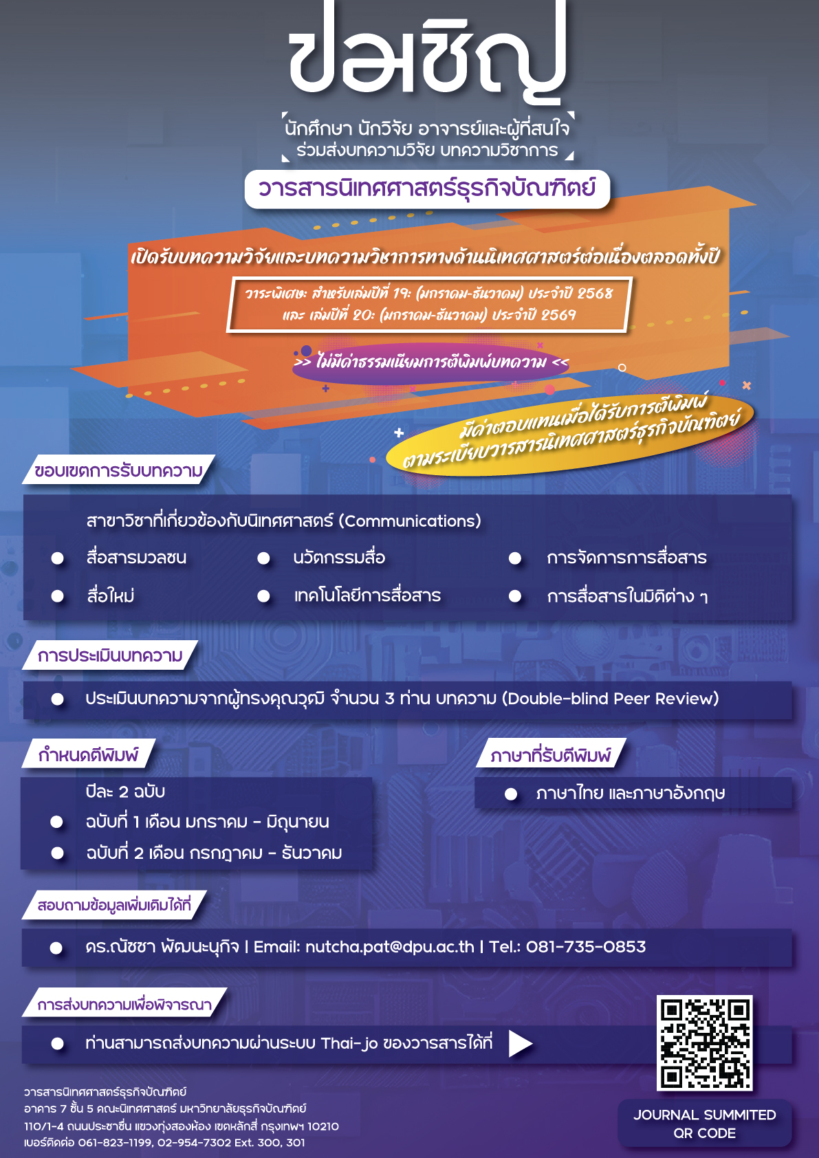 ผู้ที่สนใจเสนอบทความมาเพื่อพิจารณาตีพิมพ์และเผยแพร่ โปรดศึกษาคู่มือ และดำเนินการตามขั้นตอนที่ระบุไว้ในเว็บไซต์นี้ ทั้งนี้ บทความที่เสนอมามีเนื้อหาเป็นภาษาไทยหรือภาษาอังกฤษก็ได้ แต่บทคัดย่อต้องมีทั้งสองภาษา โดยบทความแต่ละเรื่องจะได้รับการประเมินคุณภาพเนื้อหาจากผู้ทรงคุณวุฒิในสาขาวิชานิเทศศาสตร์ ไม่น้อยกว่า 2 ท่านในลักษณะ Double-blind peer review และจะต้องได้รับผลการพิจารณา "ตอบรับการตีพิมพ์" อย่างเป็นเอกฉันท์