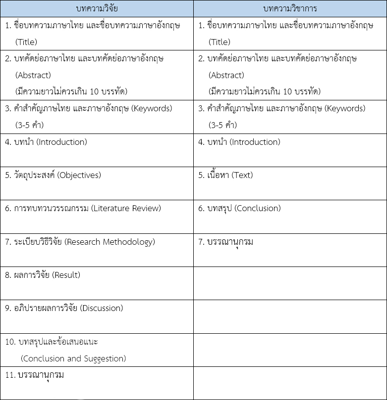5. The abstract must contain the main elements of the article, and prepared in both Thai and English with no longer than 10 lines. The Thai article must present the Thai abstract first and followed by the English one, and vice versa for the English article.