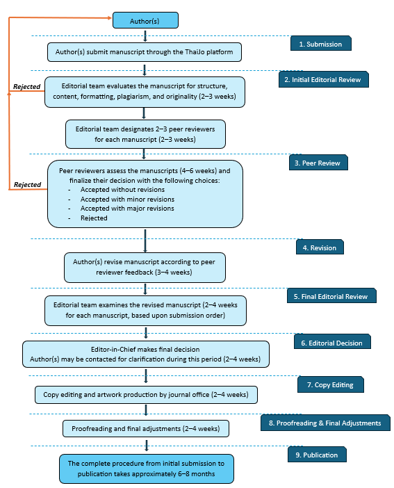Authors are required to submit their manuscripts through the ThaiJo online submission system (Please click here to submit), which serves as the official platform for initial processing and editorial management. All submissions must adhere to the journal’s author guidelines and formatting requirements to ensure a smooth and efficient review process.