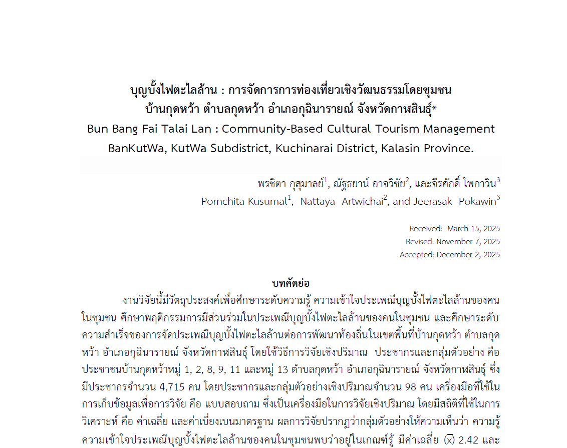 Bun Bang Fai Talai Lan : Community-Based Cultural Tourism Management BanKutWa, KutWa Subdistrict, Kuchinarai District, Kalasin Province
