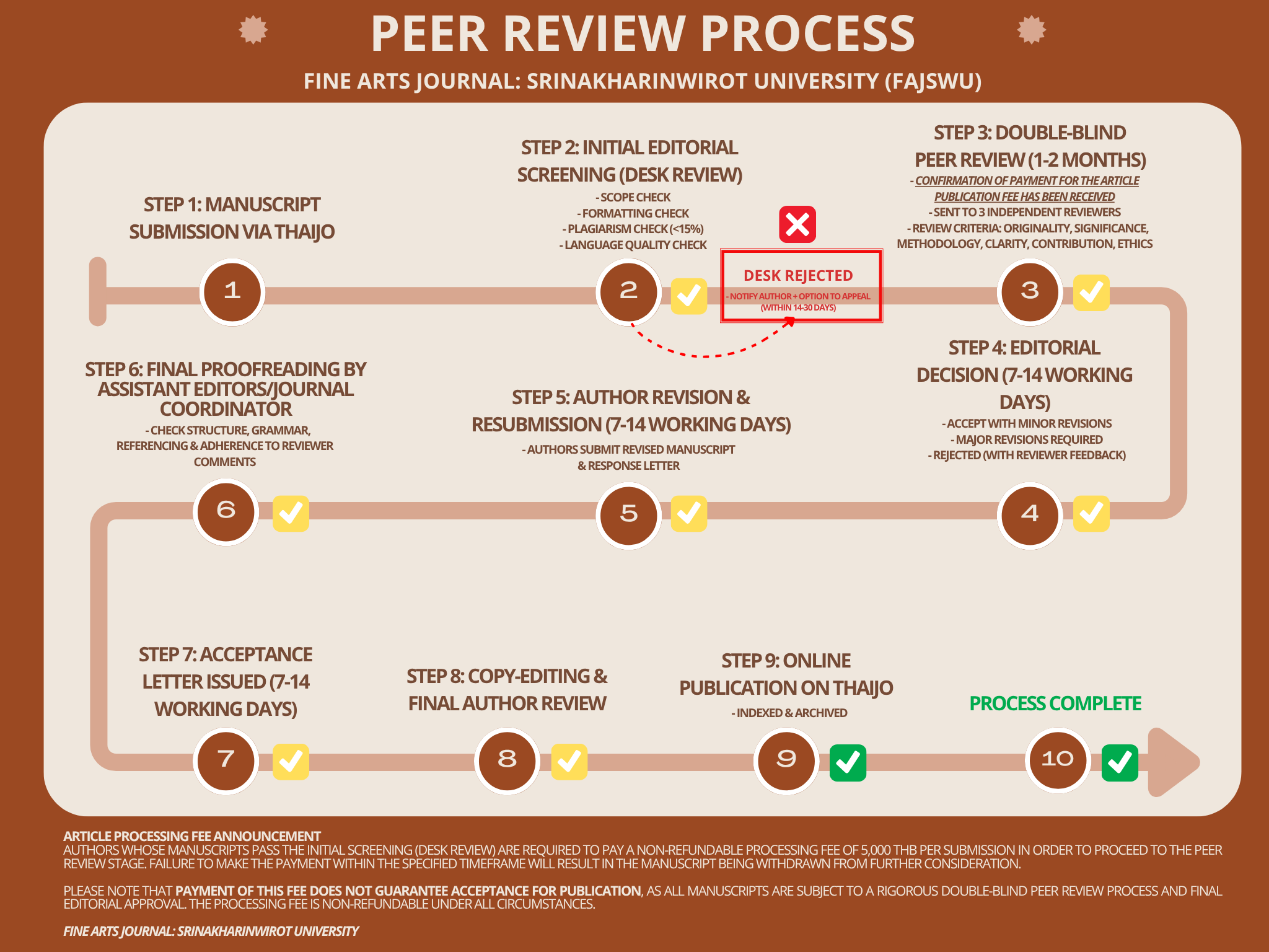 The Fine Arts Journal: Srinakharinwirot University (FAJSWU) is committed to maintaining the highest standards of academic integrity and quality. The following outlines our step-by-step peer review process, ensuring that all submissions undergo a thorough and fair evaluation. This process is designed to align with academic standards.